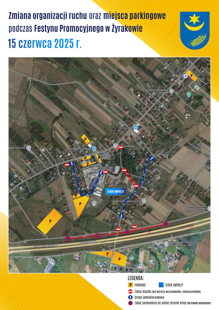 Organizatorzy Festynu Promocyjnego Gminy Żyraków, informują o zmianie organizacji ruchu oraz miejscach parkingowych na czas festynu. Możecie zapozna się z regulaminem imprezy —> TUTAJ <—