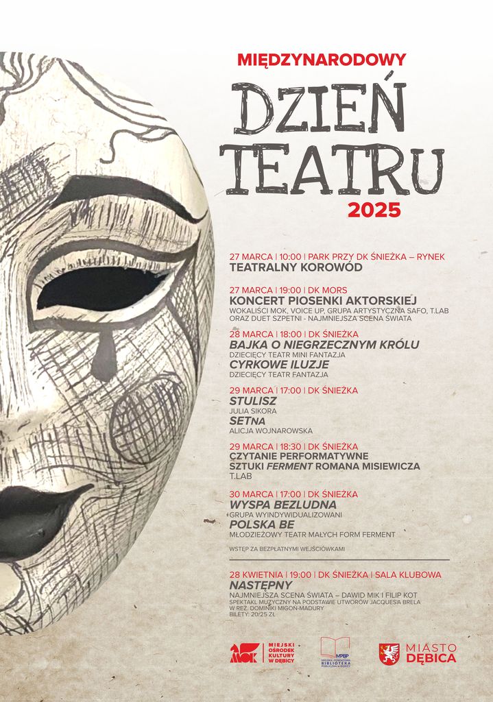 Uroczysta inauguracja świętowania nastąpi 27 marca o godzinie 10:00. Zapraszamy wszystkich miłośników sztuki teatralnej do parku przy Domu Kultury „Śnieżka”, gdzie wspólnie z uczestnikami zajęć teatralnych, ich absolwentami oraz uczniami dębickich szkół podstawowych rozpoczniemy barwny pochód. Nasz teatralny korowód przemierzy ulice Dębicy, kierując się w stronę centralnego Rynku. Przestrzeń miejska ożyje dzięki paradzie niezwykłych postaci – zobaczyć będzie można zarówno bohaterów bajkowych i literackich, ikony filmowe, jak również oryginalne kreacje zrodzone z twórczej wyobraźni uczestników.