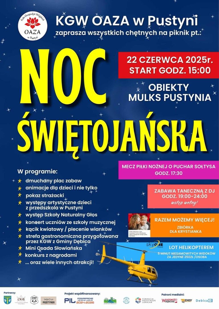 Koło Gospodyń Wiejskich „Oaza” z Pustyni oraz partnerzy zapraszają na wyjątkowy piknik „Noc Świętojańska”, który odbędzie się w niedzielę 22 czerwca 2025 r. o godz. 15:00 na terenie obiektów MULKS Pustynia.