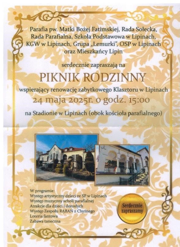 Piknik wspiera renowację zabytkowego Klasztoru w Lipinach i odbędzie się 24 maja 2025r. o godz. 15:00 na Stadionie w Lipinach (obok kościoła parafialnego)