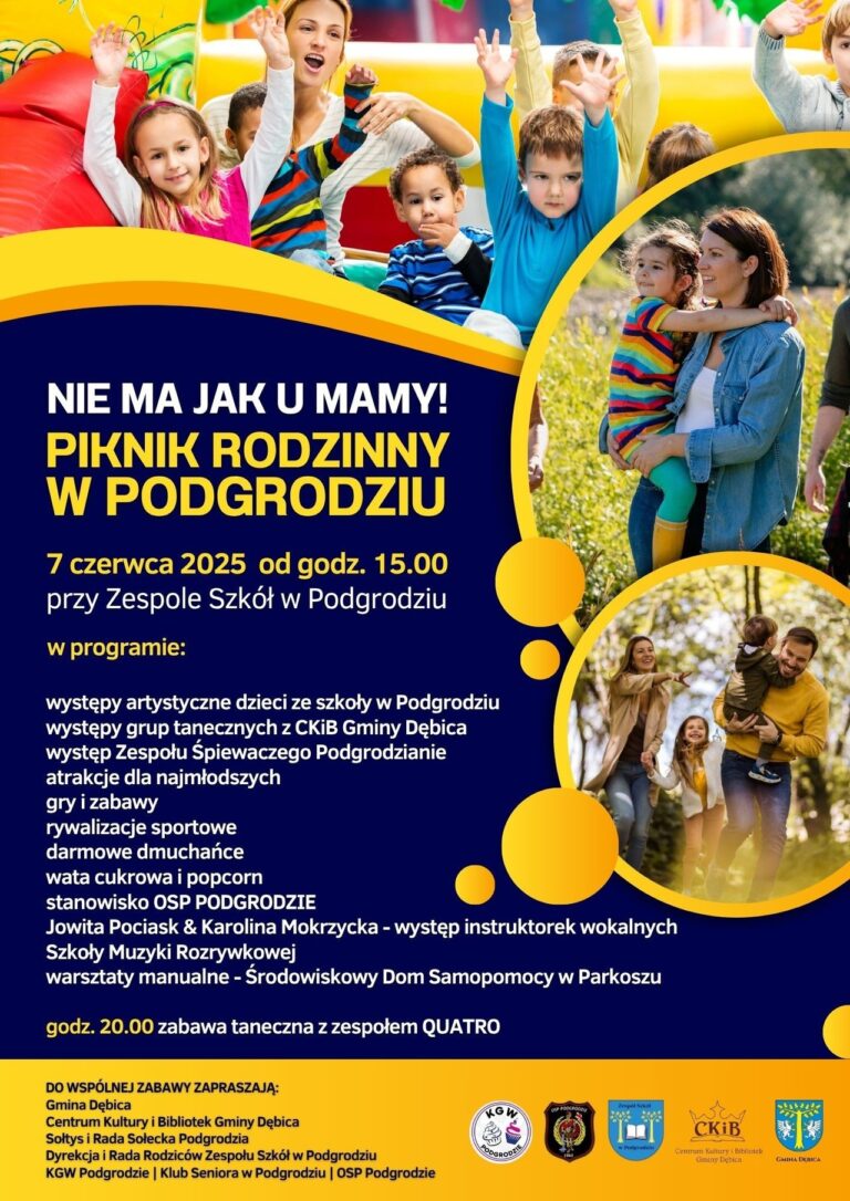 Organizatorzy serdecznie zapraszają na Piknik Rodzinny pod hasłem „Nie ma jak u Mamy!”, który odbędzie się w sobotę 7 czerwca od godziny 15:00 przy Zespole Szkół w Podgrodziu 🏫.