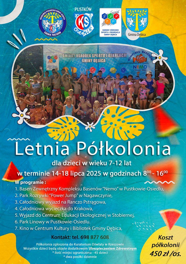Gminny Ośrodek Sportu i Rekreacji Gminy Dębica wraz z partnerami organizuje letnią półkolonię dla dzieci i młodzieży z Gminy Dębica! 🌞