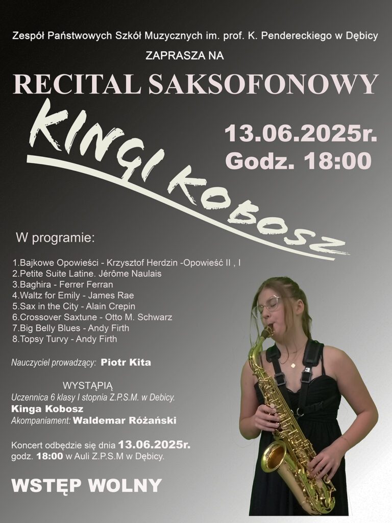 Koncert odbędzie się dnia 13.06.2025r. godz. 18:00 w Auli Z.P.S.M w Dębicy.