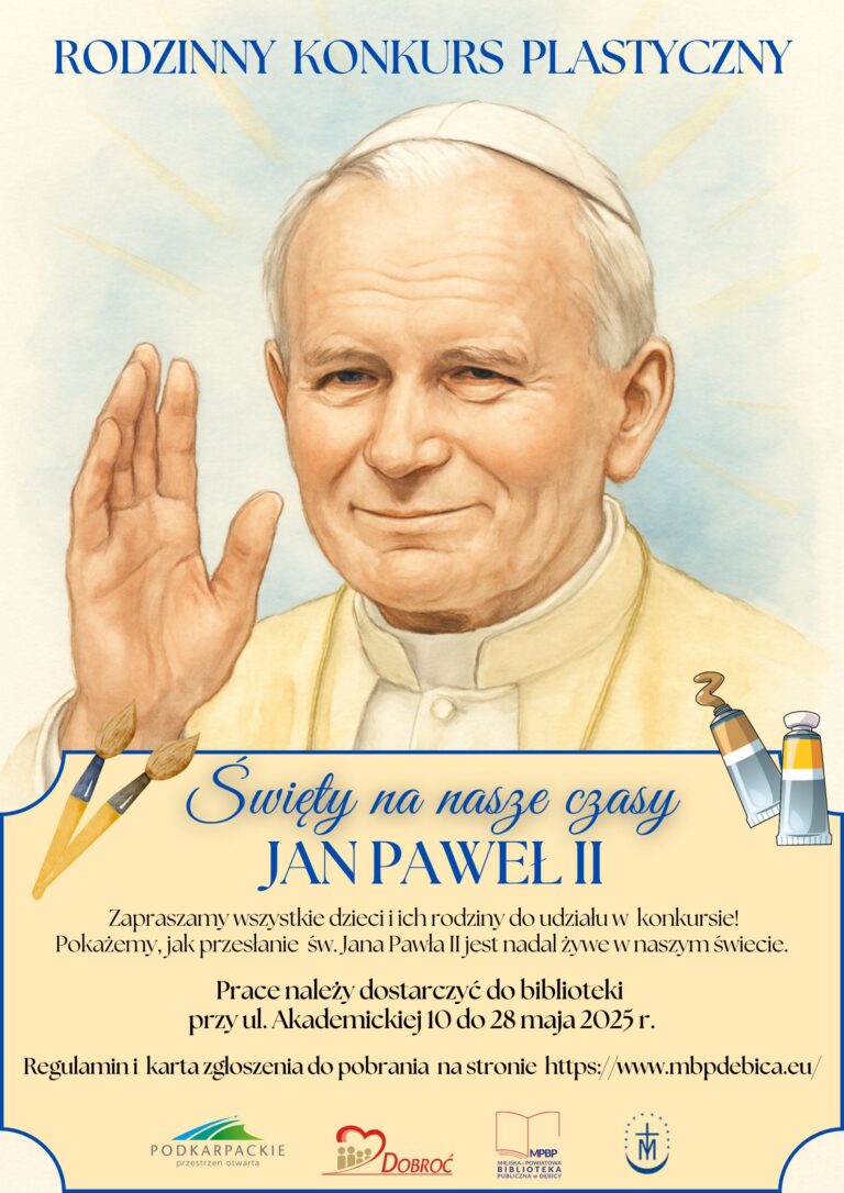 Z okazji obchodów 105. rocznicy urodzin oraz 20. rocznicy śmierci św. Jana Pawła II, Stowarzyszenie im. Edmunda Bojanowskiego „Dobroć” wraz z Miejską i Powiatową Biblioteką Publiczną w Dębicy serdecznie zapraszają całe rodziny do udziału w Konkursie Plastycznym.
