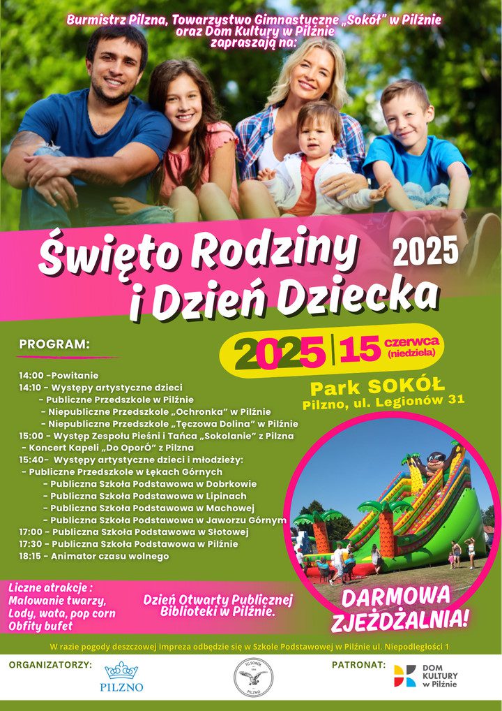 Święto Rodziny i Dzień Dziecka 2025 📅 15 czerwca 2025 (niedziela) 📍 Park SOKÓŁ, Pilzno, ul. Legionów 31