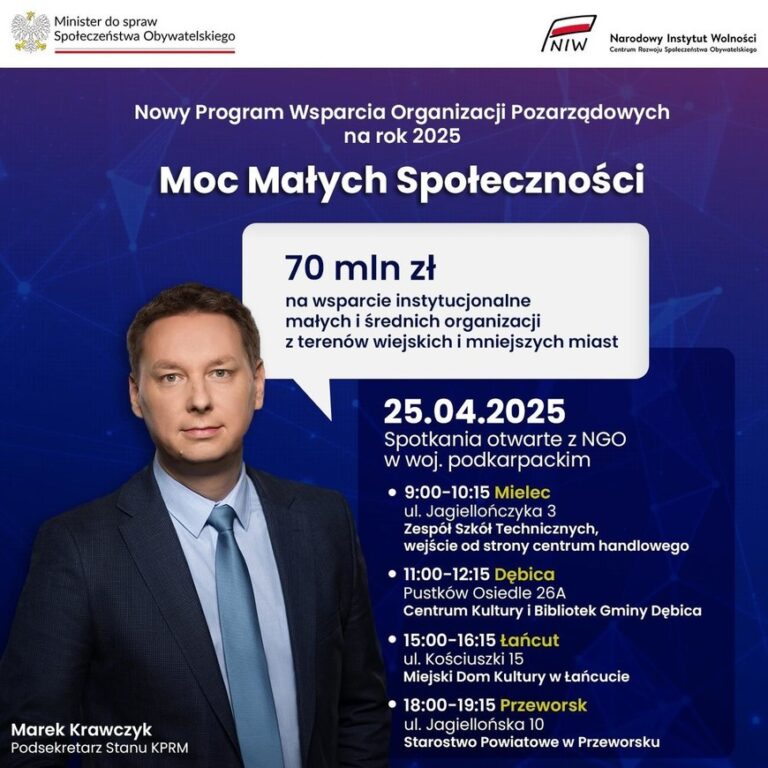 Wójt Gminy Dębica Adam Pieniążek wraz z Podsekretarzem Stanu w Kancelarii Prezesa Rady Ministrów Panem Markiem Krawczykiem mają zaszczyt zaprosić przedstawicieli organizacji pozarządowych na spotkanie informacyjne poświęcone nowemu Rządowemu Programowi Wsparcia Organizacji Pozarządowych na rok 2025 – „Moc Małych Społeczności”.